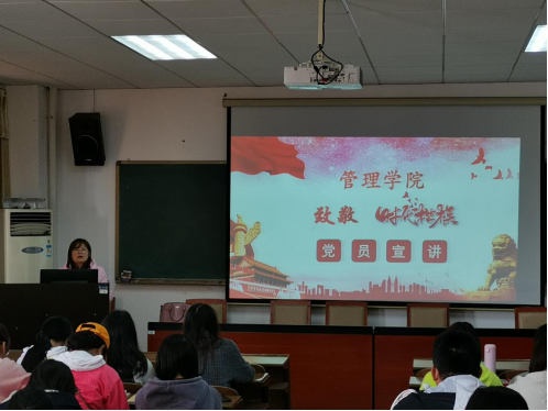 接下来管理学院分支部派代表上台进行了时代楷模事迹的宣讲。一支部由徐诚、吴优和刘琳分别讲述南仁东、杜富国和张富清的英雄事迹,他们通过ppt展示了英雄们淡泊、坚持、爱国和奉献的精神。二支部代表顾成雪用清晰干净、饱含热情的声音讲述了南东仁、杨雪峰和刘传建的英雄事迹,从这一个个的故事当中,让人感受到了拼搏奋斗的美丽,激发着全体党员为建设美丽祖国奉献自我的热情。三支部代表李金霖讲述了龚全珍、毛秉华和毛浩夫的英雄事迹,他的宣讲激情昂扬,结合配乐声和ppt,使大家对毛秉华、毛浩夫父子对井冈山红色精神的传承有了更深刻的认识。四支部由宋嘉好讲述了杜富国、陈俊武和卢永根的英雄事迹,她通过微视频播放和ppt宣讲,让同学们感受到了杜富国自强、勇敢、坚决和勤劳的精神,陈俊武攻坚克难、矢志创新的精神和卢永根在永葆初心、矢志奋斗中体现的爱国情怀。