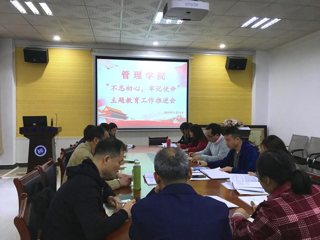2019年11月14日16:00,管理学院在F104会议室召开了“不忘初心、牢记使命”主题教育工作推进会,会议由党委书记钱祖煜主持,管理学院党委委员和各支部委员参会。