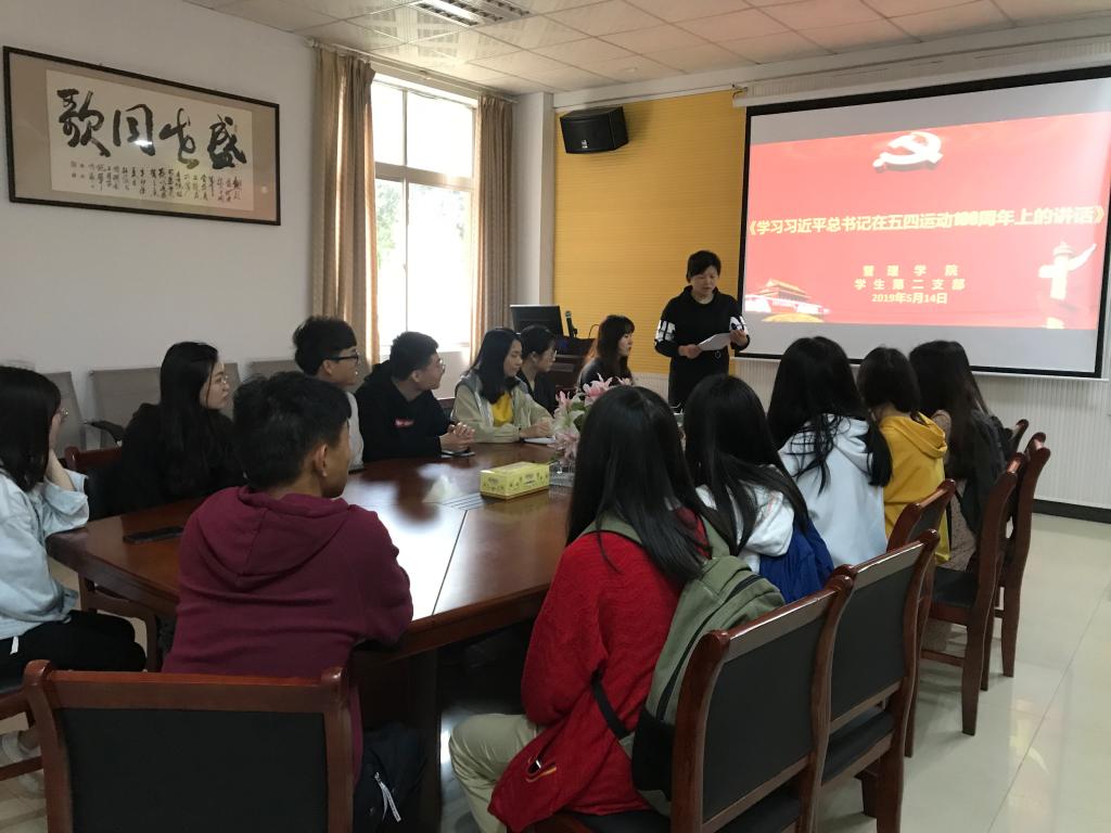 201951412401320,管理学院第二支部全体党员在教学楼f104开展了“学习习近平总书记在五四运动100周年上的讲话”的党日活动。