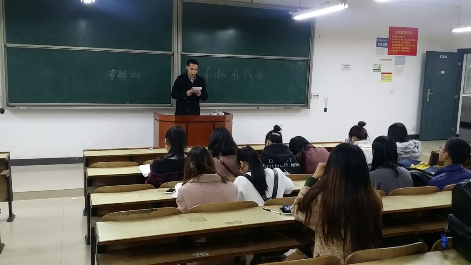 2016年11月9日下午13点30分,管理学院学生第六党支部在新校区教学主楼D栋301教室开展"讲奉献,有作为"专题讨论会。支部书记周艺老师作为本次会议的主持人,带领着在座的20位学生党员畅所欲言,就"讲奉献,有作为"这一中心抒发个人的见解。会议过程中,周艺老师首先结合自己的学习和工作经历向大家简要阐述了作为一名共产党员,应该如何去做一个讲奉献,有作为的人,同时也告诫了在座的学生党员,要想对他人奉献先要学会服务于他人,要想有作为先要给自己一个准确的定位,只有这样才能使自己的人生价值得以体现。作为一名即将毕业的大四学生,彭潇同志结合了自己在管理学院学生会当就业部部长和副主席的经历,抒发了她对奉献和作为的理解,她认为一位真正的管理者首先应该是一位乐于奉献的人,对他人奉献的多了心胸也就开阔了,给自己的定位也就更高更严了,当自己努力朝着目标迈进时其实离有作为也就不远了,最后彭潇同志用"人累了是因为他在走上坡路"这句话鼓励了在场所有党员同志都能够给自己一个小小的目标并努力向其迈进、无私地奉献他人。最后,在热烈的讨论中大家对身边的人和事、对未来都有了更加真诚的态度和更加坚定的信念,本次专题讨论圆满完成。