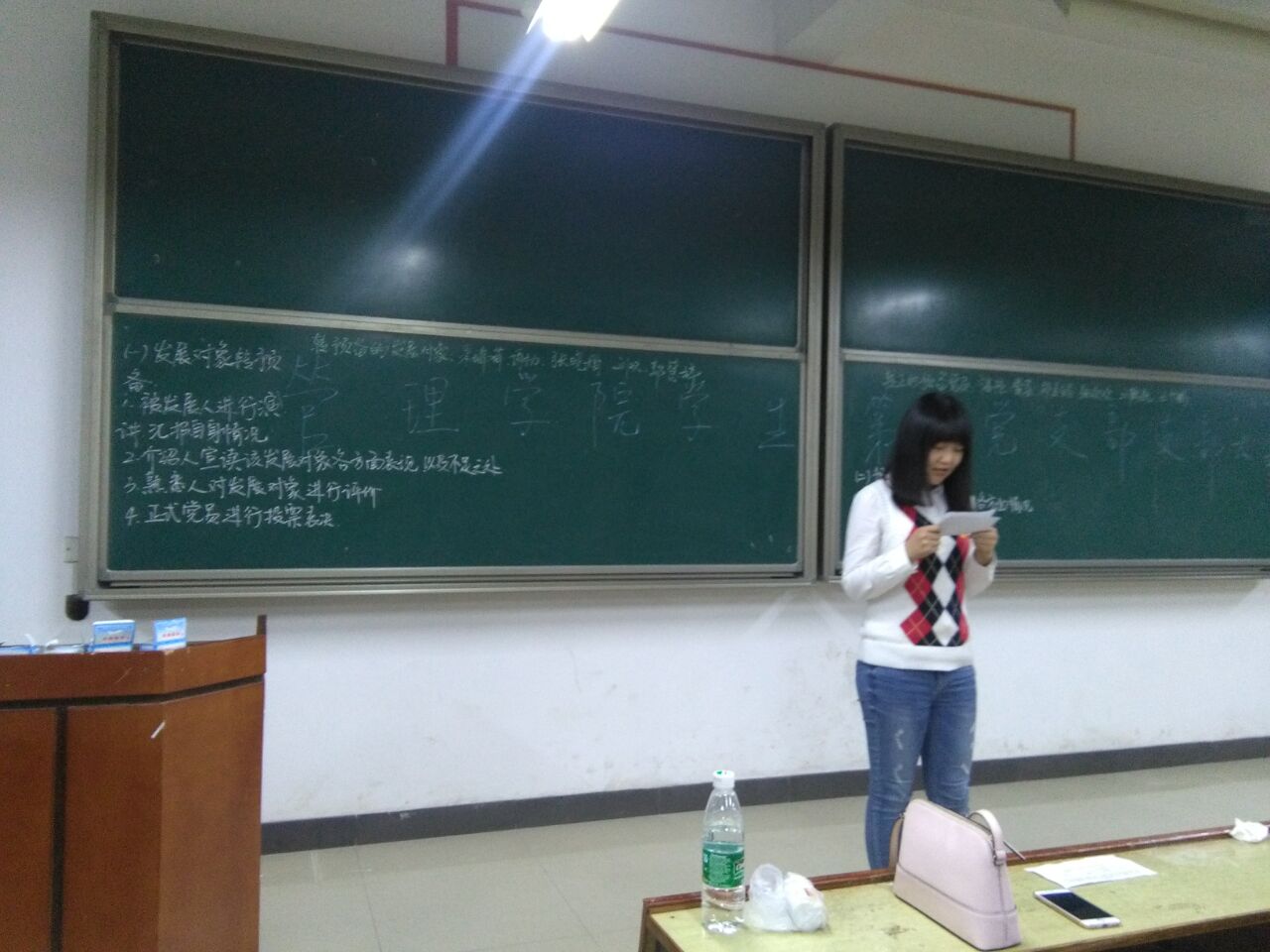 本次会议的主要内容是讨论预备党员转正式党员和发展对象转预备党员的问题。本次预备党员转正的有王少鹏、王鹤凯、张欢欢、潘艳、郑美龄共5人,发展对象转预备的有刘双、朱瑞萌、张晓娟、谢力、郭慧婷共5人。在本次大会中,发展对象首先上台汇报申请入党过程中表现、家庭及社会关系政历情况和需要向组织说明的问题,然后由介绍人介绍被发展人基本情况、思想状况、表现情况、政治觉悟及入党动机和不足等,宣读介绍人意见,再由熟悉被发展对象的同学发表对被发展对象的评价,最后由正式党员投票表决。在这整个过程中,每一个被发展对象都详尽的汇报了自己在入党过程中思想的转变及在入党过程中学习、生活、工作等方面情况,并经由其介绍人宣读意见和熟悉人发言后由正式党员表决并都全票通过。在讨论了发展对象转预备问题后,大会又讨论了预备期满的预备党员转为正式党员的问题。在要转正的预备党员上台汇报了一年考察期内思想,工作,学习等方面情况后,经正式党员表决全票通过。