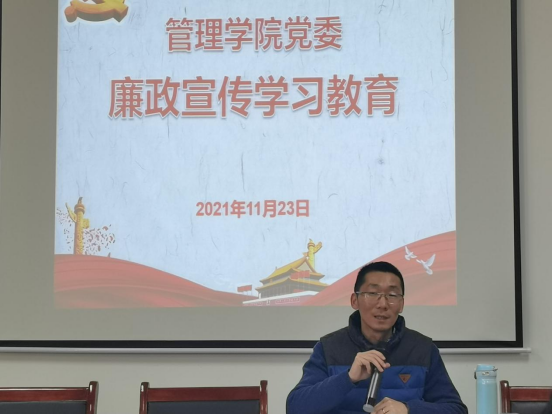为有效落实学校开展的廉政宣传教育月活动,进一步增强教师党员干部党性观念,警示教育党员干部,严守底线,不越红线,2021年11月23日下午16:00,管理学院党委组织学院全体党员在G505廉政宣传学习教育党员大会。会议由院党委副书记谭超主持,学院44名党员参加了本次教育学习。