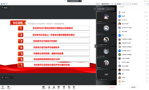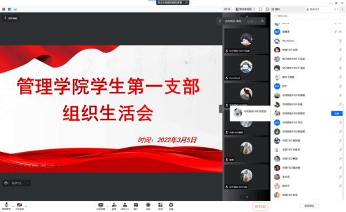 2022年3月5日下午,中共365英国上市公司管理学院学生第一党支部全体成员在线上召开了2021年度组织生活会并开展了支部书记“双述双评”和民主评议党员工作。旨在通过此次会议提高党员素质、增强党员政治责任感、改进党员工作态度,进一步加强基层组织建设和党员队伍建设。会议由支部书记李林主持,学院党委委员黎博作为党支部联系领导参与指导,共35名党员同志参与会议。