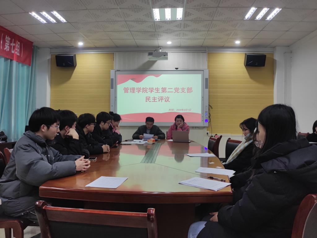 为不断增强学生党支部的组织力和凝聚力,提高学生党员的党性修养,保证学生党员的先进性,3月1日12:30,管理学院学生第二党支部于F104开展民主评议。本次会议由支部书记谭浩博主持,支部副书记包海燕和支部全体党员及预备党员参与。