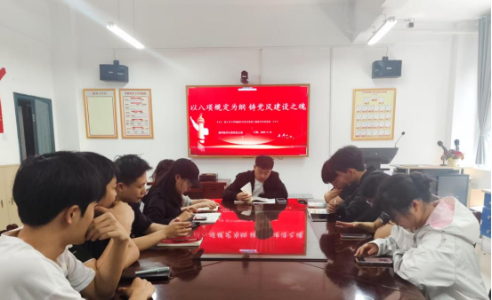 为深入贯彻中央八项规定精神学习教育,学习领会和贯彻落实中央八项规定及其实施细则精神,4月10日,商学院学生第四党支部在G-115开展“以八项规定为钢,铸党风建设之魂”的支部大会,支部全体党员参加。