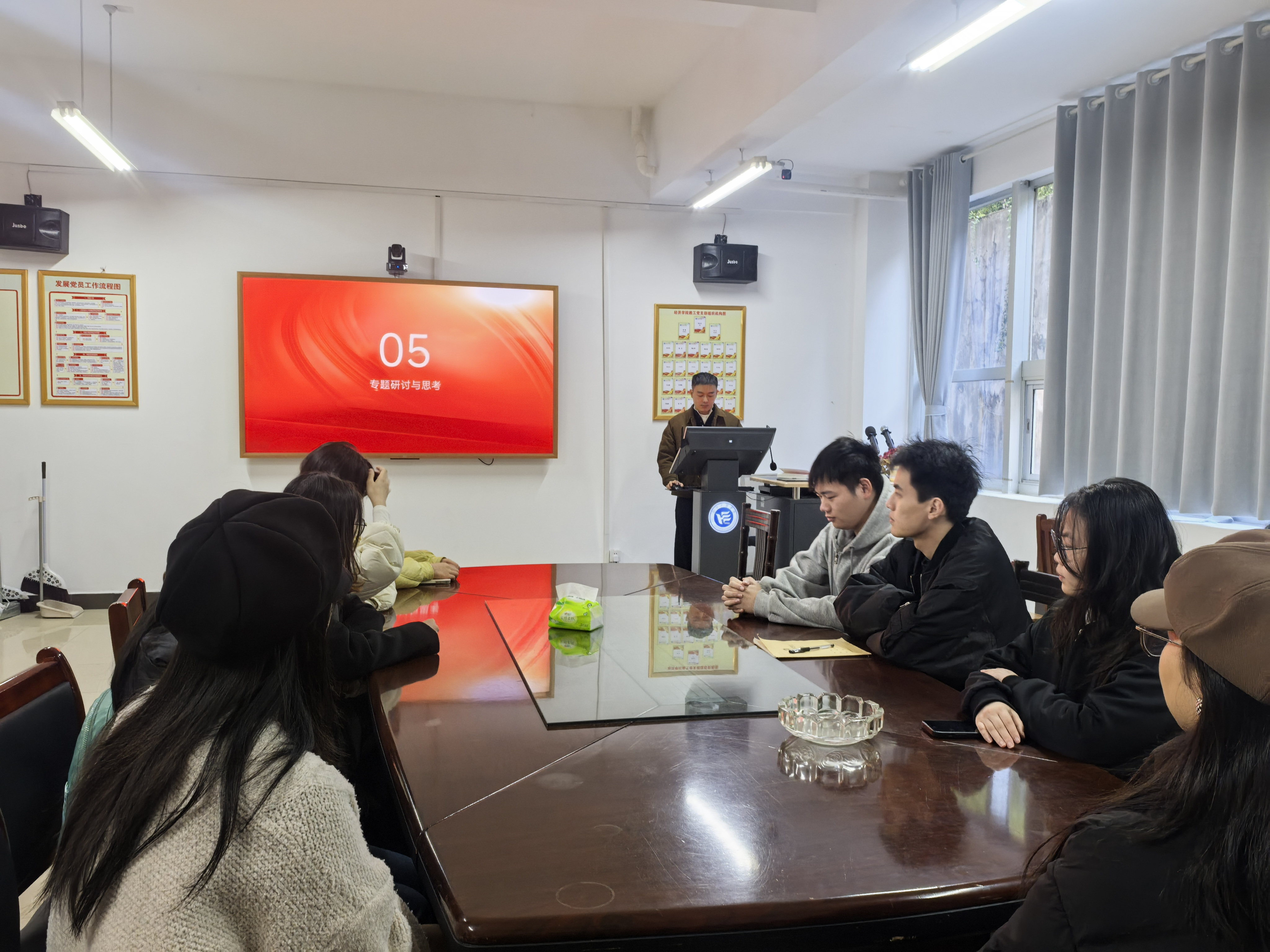 为深入学习贯彻党的二十届四中全会精神,扎实推进理论武装走深走实, 11月19日,商学院学生第四党支部于G-115会议室开展“深学全会精神,续写奋进新篇”专题学习研讨活动,支部全体党员参会学习。