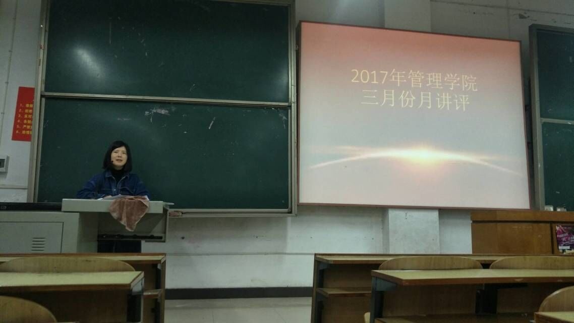 2017年3月13日中午12:20,管理学院工商管理、会计学单学号、物流管理、资源人力、旅游管理全体人员,在主校区教室内进行本学年第一次月评会议。学办辅导老师罗荃、黎博、包海燕、周艺、宋志航对工商管理、旅游管理、人力资源管理、会计学、物流管理六个,专业展开本月讲评。本次会议还有一道靓丽风景,由单艳艳老师召开心理专项会议。心理会议由大一全体心理委员、心理朋辈辅导员、寝室长,以及心理部部干事到会。