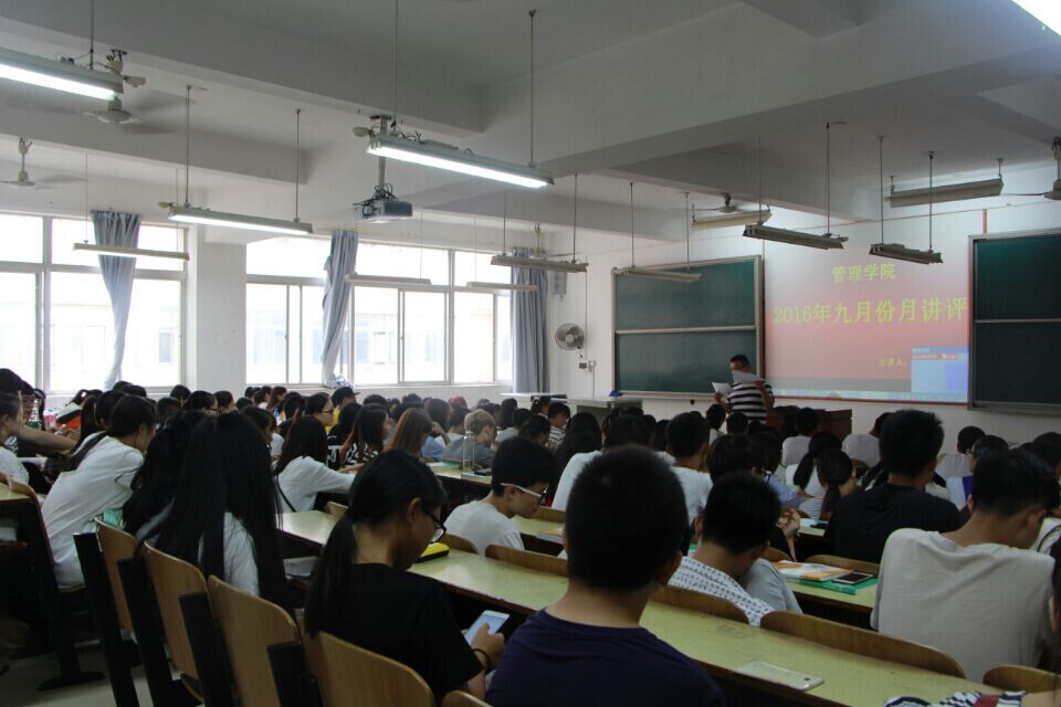 本次月讲评主要内容包括:1.2015-2016学年班级考核排名情况公布。2.公布分管专业班级的排名情况,奖学金评定情况。全院参评奖学金人数1376人,参评班级共39个班,其中获特等奖学金7名。一等奖72名,二等奖198名,三等奖222名,三好学生136名,优秀干部58名,单项奖2名,先进班集体4个,校级到课率优秀班级共18个班级。3.宣读旷课学生处分通知,希望同学们积极改进,提高上课积极性。4.说明了学生医疗保险办理相关流程。5.贫困生资助相关工作,每年9月20日左右会更新贫困生库,新生入库,老生补录入库。6.重申请假制度,把请假制度进一步规范细化。7.公布宿舍管理制度,严格检查大功率,晚归,未办理走读手续,私自住在校外的同学。8. 公布教室卫生管理条列,使教室卫生进一步提高。9.就近日社会上发生的一系列大学生钱财被骗事件、学生安全意外事件进行讲解,提醒全体学生主要防盗、防骗、防病、防意外,安全教育对于全体学生意义重大。10.提醒毕业生优化个人简历,以优秀的状态积极参与学校组织的专场招聘会,慎重选择。就业服务工作的指导使毕业生受益匪浅,把理论转换为实践,使毕业生收获更多。11.公布了9月28日晚上党校开课纪律要求。以及对到课率情况、晚归情况、不合格寝室、优寝情况、教室卫生等常规工作进行通报。12.通知团总支主要学生活动:挑战杯大赛项目申报、学校创业孵化基地团队入驻申报、校运会报名和组织训练。