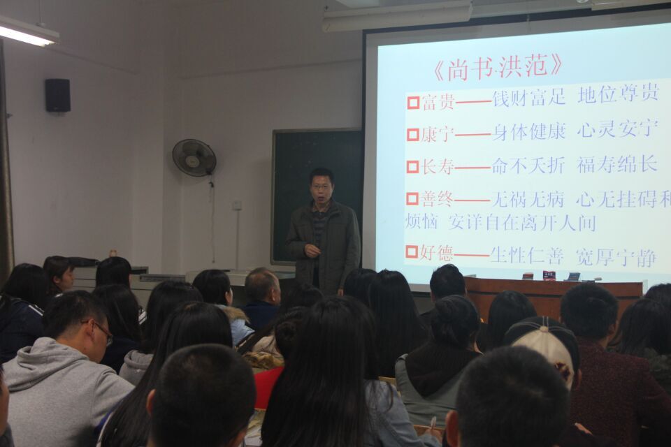 米老师将博大精深的中国传统文化与沧生百态衔接起来,教育学子们如何去寻找人生的幸福。米老师讲到:“五福就是富贵、康宁、长寿、善终和好德,而最重要的就是’好德’。因为德是福的原因和根本,福是德的结果和表现。”短短80分钟的讲座,给学生们理清了为什么读大学的思路,带来坚定的信念,在场的同学们纷纷表示获益匪浅。