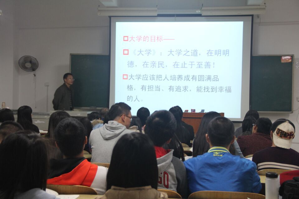 11月8日晚7点,管理学院旅游管理2015级“传统文化进班级”系列活动在教学楼B402正式开班,旅游管理教研室米振华老师开授第一讲《你为什么上大学》。讲座邀请到学生办公室主任罗荃老师、岳塘区法院法官刘志钢和湘潭市传统文化研究会会员张万福老人等热爱传统文化的长辈前来聆听。