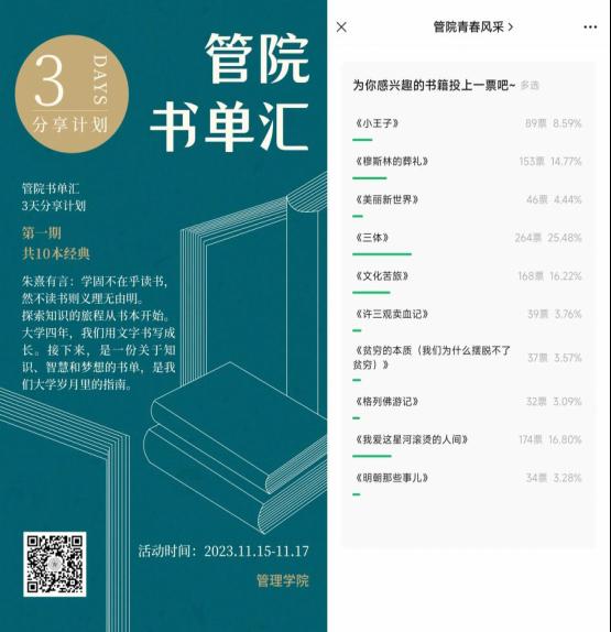 15日,管理学院在“管院青春风采”微信公众号开展了一期“管院书单汇”书籍投票活动,共发布十余本书籍。在同学们的积极参与下,经过为期三天的票选,刘慈欣的《三体》、韦娜的《我爱这星河滚烫的人间》、余秋雨的《文化苦旅》、霍达的《穆斯林的葬礼》、安托万·德·圣-埃克苏佩里的《小王子》成为2023年秋季学期管理学院最受欢迎书单。今后,管理学院将持续开展“管院书单汇”书籍投票活动,让更多的书籍走进同学们的学习生活中,进一步提升同学们的自身的阅读能力和思考能力。