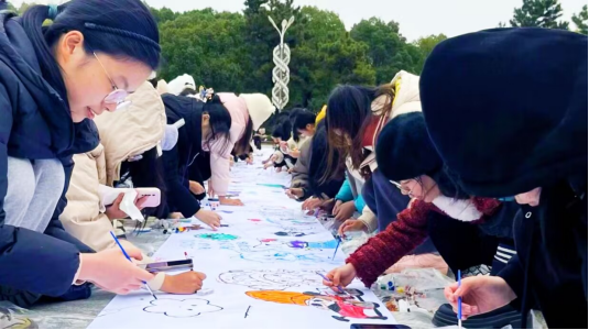 活动伊始,管理学院心理部成员组织同学们在知行广场集合,并向同学们讲解此次活动的参与形式与注意事项。活动期间,同学们遵守规则、积极参与,认真在画卷上进行大胆创作,并与周围的同学分享自己的作品与创意。在同学们大胆地想象与认真地创作下,各类画面生动、内容精彩的绘画作品展现在百米画卷上,共同组成一幅丰富特别的画作。活动现场气氛活跃,场地上充满同学们的欢声笑语,在同学们的热烈反响下,此次百米画卷活动圆满完成。