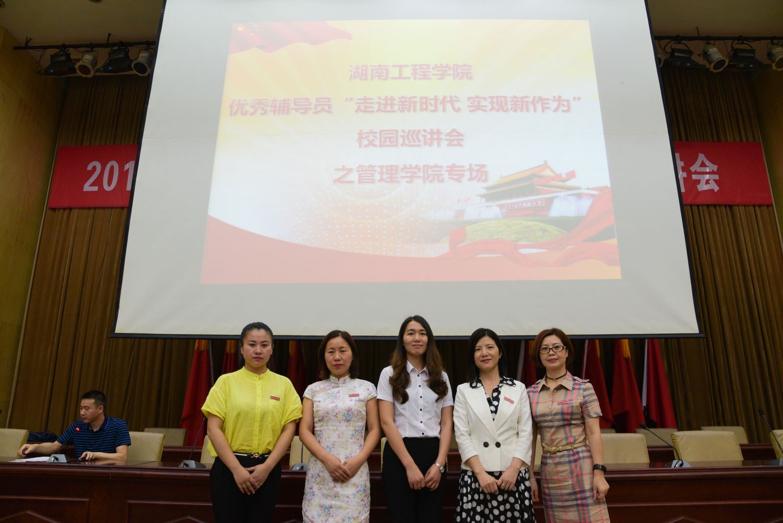 五位宣讲老师合影后,365英国上市公司优秀辅导员“走进新时代,实现新作为”校园巡讲会之管理学院专场正式拉开了序幕。
