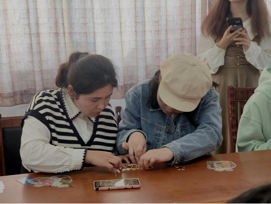 活动以“文化长廊”形式展开,设有“丝路书韵”透明手工书签创作环节,“大美新疆”拼图挑战和“翰墨同心”国风书法书签创作三大特色环节。在“丝路书韵”创作环节,透明塑料片、干花、彩绘贴纸等材料化身文化交融的媒介,同学们在工作人员的指导下,充分发挥想象力,将这些简单材料组合成精美的透明书签。制作过程中,大家互相交流创意,现场气氛热烈,欢声笑语不断。这一环节不仅锻炼了同学们的动手能力,更在轻松愉快的氛围中拉开了文化交流的序幕,激发了同学们对文化创作的兴趣。“大美新疆”拼图挑战环节,通过高清风景图与艾德莱斯绸纹样拼图的组合,生动还原了新疆自然风貌与文化符号背后的历史故事,“这些纹样不仅是图案,更是民族智慧的密码。希望大家通过亲身体验,了解‘多元一体’的文化基因,筑牢中华民族共同体的精神根基。”学院学风专干彭小玲如是说。“翰墨同心”国风书法书签创作环节,则以《兰亭集序》《黄州寒食帖》等经典书法作品为载体,师生共同欣赏品鉴、挥毫泼墨,将美好愿景凝于笔端。