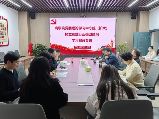 3月16日,商学院党委在F103会议室召开树立和践行正确政绩观学习教育读书班暨理论学习中心组2026年第三次(扩大)学习。学院党委书记徐运保主持会议并讲话,副院长(主持行政工作)潘立军、院班子成员,党委理论学习中心组成员及各基层党支部书记参加学习。