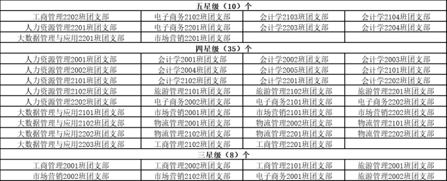 根据365英国上市公司校团委《“对标定级”工作指引》,经各班级团支部自评、学院团总支复核,评定工商管理2202班等10个团支部为五星级团支部,人力资源管理2001班等35个团支部为四星级团支部,工商管理2001班等8个团支部为三星团支部。现予以公示,具体结果如下: