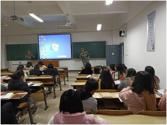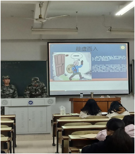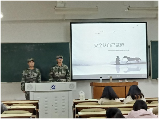 刚开始时,队员们都还没有走进门,教室里面便已经响起雷鸣班的掌声。这是对新校区校卫队的信任也是对他们的鼓励,对同学如此热情的掌声以及期待,队员们能够做的只有献上一次好的宣传来加强同学们的安全意识,为同学们的安全能够更好的得到保障。在做完自我介绍后队员邓淼用一套气势如虹,一气呵成的擒敌拳作为开场表演开始了他们的演讲。