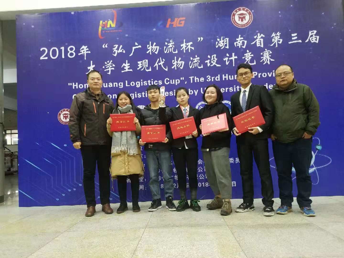 2018年12月8日,“弘广物流杯”湖南省第三届大学生现代物流设计竞赛决赛在湖南商学院落下帷幕,我校参赛队伍喜获佳绩,由物流管理专业16级金科美等5位同学组队,潘立军、黄韧老师指导的 “夜空中最亮的星”代表队获省二等奖,由物流管理专业15级邱瑾等5位同学组队,李智斌、张思军老师指导的“龙门镖局”代表队获得省三等奖。
