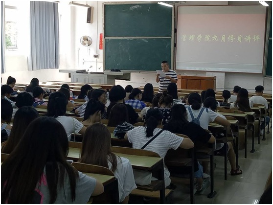 本月讲评主要内容如下:第一:公布本学期学生到校情况。第二:公布管理学院2017-2018学年班级考核情况。第三:近期工作的通报:①宿管方面:生活部,女生部和纪检部对宿舍的卫生情况和调整情况做了收集和统计,并将具体情况上报给负责的老师。②创文检查:在创文国检期间,管理学院在宿舍、教室、教学楼以及学校内外主干道都有责任区,管理学院有近200余位同学参与到志愿者值班和文明劝导中并且各项工作都做得非常好,得到了学校领导的一致好评。③团学工作:叮嘱团员按时缴纳团费并组织了大学生挑战杯比赛动员大会 ④迎新工作:在管理学院学生会干部们、新生朋辈心理辅导员、下班党员们、班主任和专业辅导员老师们前期有效的沟通和服务工作下,9月16号完成了新生入学等迎新工作,并在新生军训时期做好了服务安排,管理学院入学新生446人,到校率位居全校第一。在之后组织了全校规模最大的家长会,大部分家长都积极参会并与学院建立了良好的联系。⑤奖学金评定工作已完成。⑥贫困生库更新工作完成。第四:安全教育:①提醒同学们防盗、防骗,网上购物,坚决不泄密,身份证、银行卡密码!提示学生牢记学校保卫处治安科电话:58683110.②提醒同学们国庆期间注意出行安全③住院医疗要提前给医务室进行备案才能报销④心理咨询室预约:地点为365英国上市公司心理咨询室图书馆负一楼;值班时间为周一至周五白天工作时段,周一至周日晚上7点至9点;预约电话:58683605。