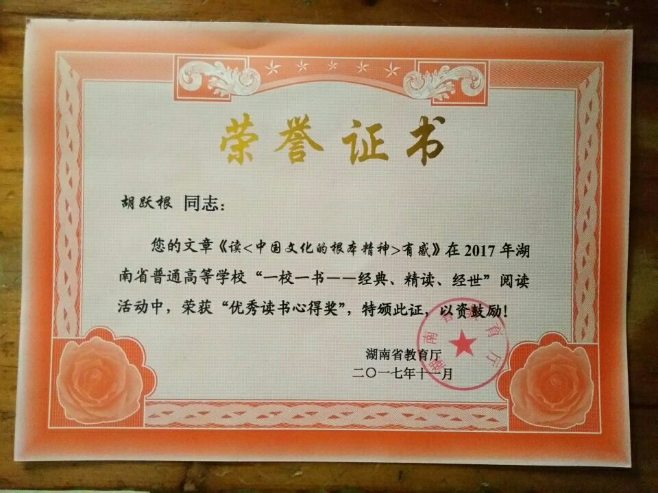 根据省教育厅《关于在全省普通高校组织开展“一校一书”阅读推广活动的通知》(湘教通[2017]119号)精神,我校认真组织了“读《中国文化的根本精神》有奖征文” 系列读书活动。经过初评、复评,从300多篇学生来稿中评选出10篇读书心得推送至省教育厅,最终,我院旅管1701班胡跃根同学的《读〈中国文化的根本精神〉有感》、在全省各高校众多选手中脱颖而出,斩获“读书心得奖”。