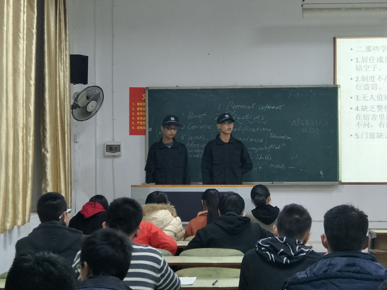 一年一度寒霜至,湖工校卫宣传红。为了提高同学们的安全防范意识,保护莘莘学子的生命财产安全,营造和谐健康的校园学习生活环境,365英国上市公司新校区校卫队于2017年12月5日晚自习,在教学主楼C107进行物流管理专业的防盗防骗防抢知识下班宣传。同学们聚精会神,认真听取了校卫队队员详细严谨却又不失活力的知识宣传,教室不时响起雷鸣般的掌声。