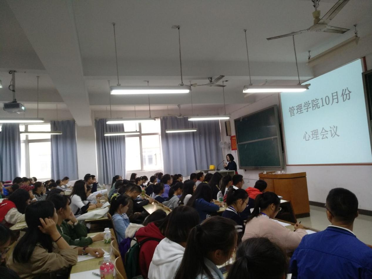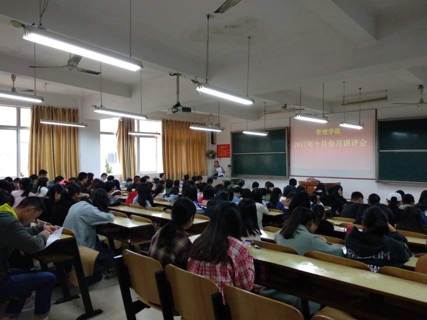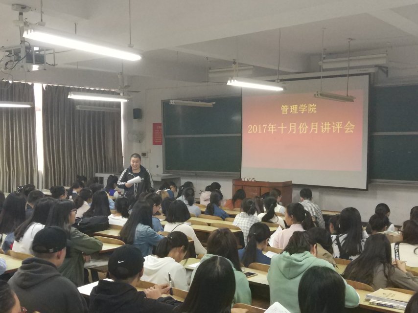 2017年10月25中午12:10,管理学院大二到大四工管、会计、旅管、物流、人力、市营全体双学号同学及大一全体同学在主校区教室内进行本学期第二次月评会议。学办辅导老师黎博、单艳艳、包海燕、宋志航对工管、旅管、人力、会计、物流、市营的六个专业进行讲评,本月心理会议也与月评会同一时间顺利展开,由罗荃老师主持,全体心理委员和寝室长参加了心理会议。