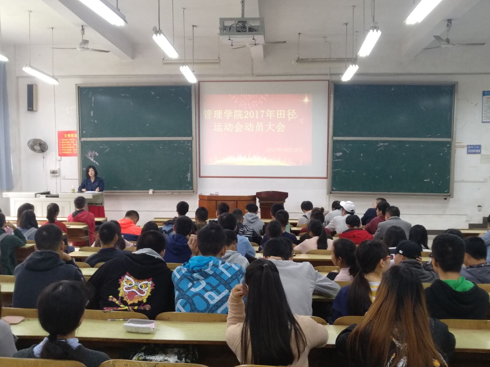 距离让人期待的运动会还有两天,为了确保运动会各项赛事的顺利进行,使运动员充满活力的迎接赛事,运动会动员大会于10月25日12:30正式召开,本次动员大会由学办主任罗荃老师和团支部书记黎博老师主讲。
