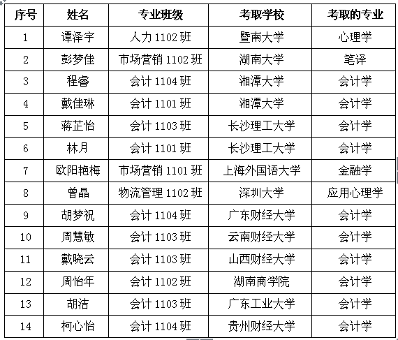昨日挥洒辛勤的汗水,今日收获累累的硕果,2015年管理学院2015届毕业生考研再创佳绩。学子们通过勤奋努力学习,积极准备考试和复试,我院共有14名学生成功考取了研究生,其中不乏考入暨南大学、湘潭大学、上海外国语大学、广东财经大学、湖南大学等著名高校的优秀学子。