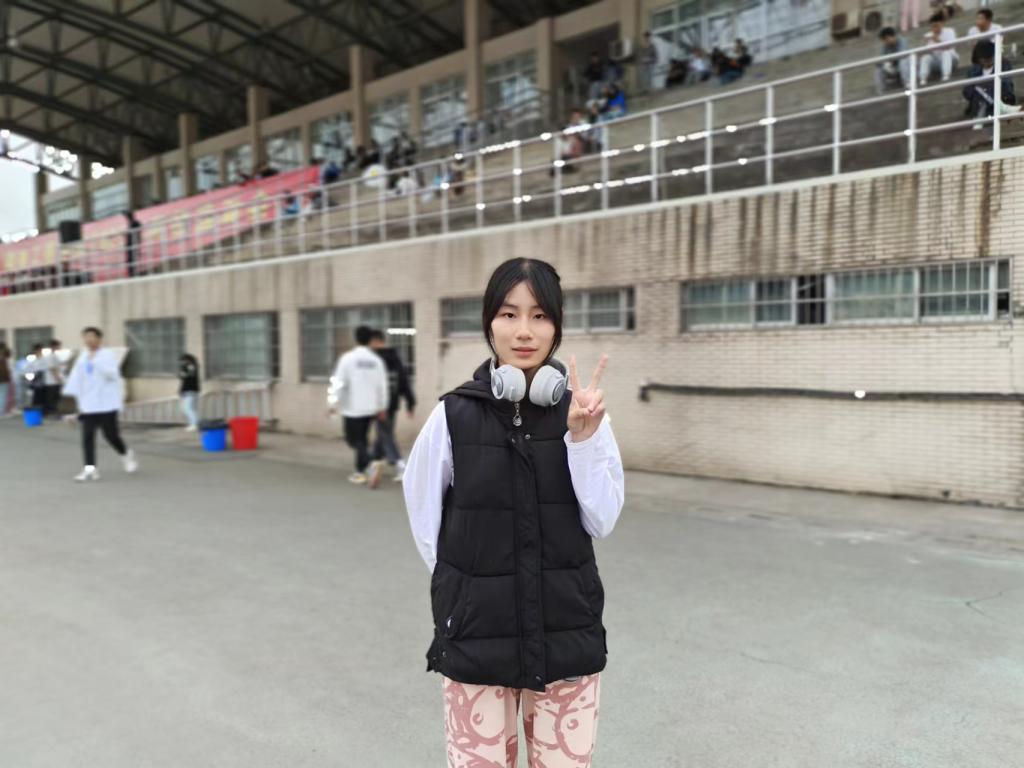 蒋嘉莉同学,来自湖南衡阳,在此次运动会中,她以15秒66的成绩,斩获了女子100米第6名。回想此次运动会,她说可以用“惊心动魄”来形容!她并不是一名专业体育生,当与身材高挑、健硕的专业运动员站在同一起跑线上时,她比较紧张,也感受到了前所未有的压迫感,但她说,这种压迫感反而给予了她更多的动力。“我生来就是高山而非溪流,我欲与群峰之巅俯视平庸的沟壑”,这句话是蒋嘉莉同学的座右铭,比赛时也萦绕在她的脑海中。