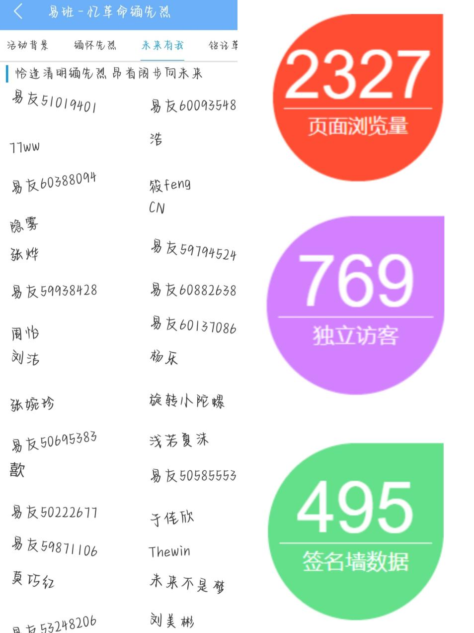 活动以易班APP为依托,搭建“忆革命 缅先烈”主题平台,在该平台以H5的形式通过图片、文字、视频等介绍革命先烈及其英勇事迹,学生在充分了解革命先烈艰苦卓绝的斗争经历后,可在“未来有我”签名墙上签名。便捷且仪式感满满的活动形式吸引了广大青年学生主动参与,并在学院学生群体中引起热议。据后台数据显示,共计3591人次浏览并参与活动。与此同时,学院组织开展“恰逢清明缅先烈,昂首阔步向未来”主题班会,利用PPT展示、播放影片等方式,使广大青年学子进一步了解感悟革命先烈面对困难英勇斗争、勇往直前的大无畏精神。