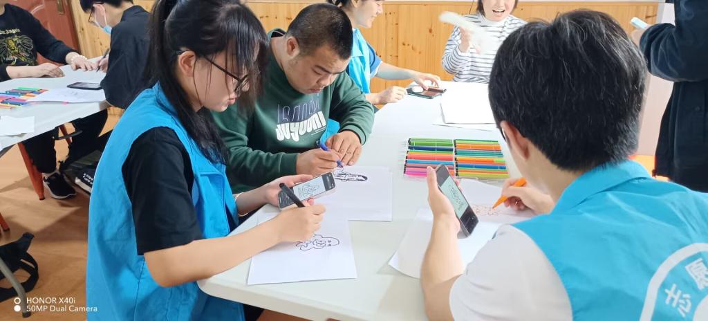 首先由负责人讲述亲园小伙伴们的近况,然后对今日活动流程做了介绍。志愿者们和自己的小伙伴们做好准备后,活动开始。与往常不同的是,本次有多支志愿者队伍参加活动。蓝丝带联盟的志愿者们选择陪伴亲园小伙伴们绘画,进行室内活动。选择好合适的图案后,志愿者们和小伙伴们拿上画笔,合力创作独属于他们的画卷。对动手能力稍弱的小伙伴,志愿者们进行了指导和教学,各种图案、颜色层出不穷。除此之外,休息时间志愿者们还带着小伙伴们唱起了拿手的歌曲,最后在欢声笑语中结束了本次活动。