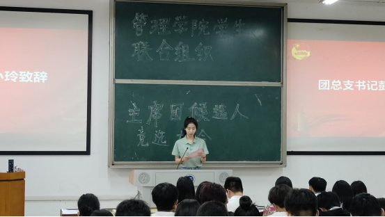 会议第一项,管理学院团总支书记彭小玲致辞,她肯定了2022-2023届学院团学干部的工作,感谢各位团学干部对学院发展所做贡献,同时对新一届学生干部提出了坚持理论学习,信仰在心;坚持敢想敢为,担当在肩;坚持服务师生,用情在心三点希望,希望新一届主席团不忘初心,不断坚定理想信念,做好服务同学、服务学院大局的工作,使管理学院学生联合组织驰而不息、赓续荣光!