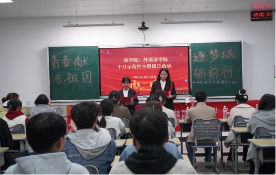 为深入学习贯彻习近平新时代中国特色社会主义思想,引领青年学子厚植家国情怀、勇担时代使命,10月23日晚,在校团委的指导下,商学院与外国语学院在主教学楼C309教室联合举办了“青春献礼祖国,逐梦砥砺前行”示范性主题团日活动。校团委副书记涂璐、商学院党委副书记谭超、商学院团委书记邹牡燕、外国语学院团委书记彭虹出席活动,英语2501班、电子商务2401班全体同学共同参与。