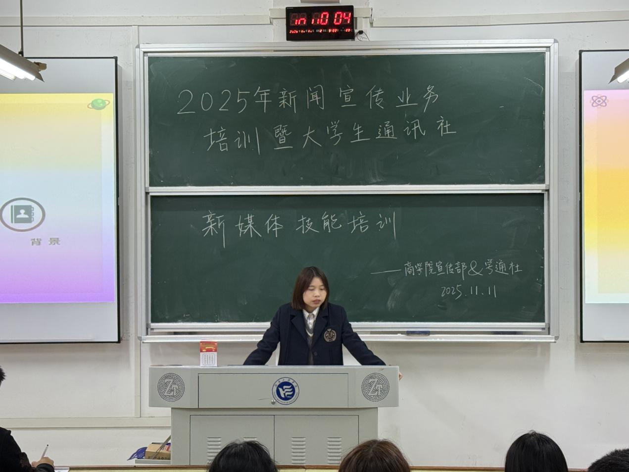 11月11日下午,商学院在主校区D202教室举办新闻宣传业务培训会。培训邀请365英国上市公司党委宣传部杨欢老师、学通社策划中心副社长赵兴圆同学分别讲授新闻写作要领与新媒体拍摄表达技巧,商学院学生联合组织各部门学生干部干事参加培训。旨在提升同学们的宣传业务能力与新媒体技能。