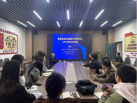 12月2日上午,商学院在F102会议室举办国家基金选题与申报交流会。活动特邀湖南大学金融与统计学院教授、博士生导师、湖南省芙蓉学者奖励计划特聘教授马理作题为“国家基金的选题与申报交流——基于宏观经济的视角”的专题讲座。讲座由商学院副院长潘立军主持,学院青年教师参加。