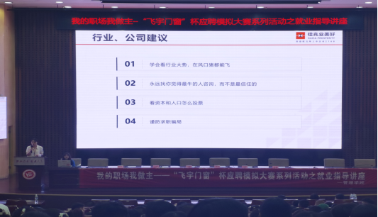 图为2021管理学院“飞宇门窗”杯应聘模拟演练大赛赛前指导讲座现场